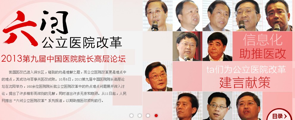 •     2013第九屆中國醫院院長高層論壇在沈陽勝利召開。本屆論壇以“信息化助推醫改”為核心議題,由衛生部新聞宣傳中心、中國醫院協會、人民日報社人民網和遼寧省衛生廳共同主辦,中國醫科大學盛京醫院承辦。