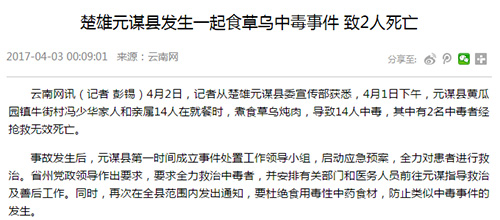 據(jù)云南網(wǎng)4月3日?qǐng)?bào)道:“4月1日下午,元謀縣黃瓜園鎮(zhèn)牛街村馮少華家人和親屬14人在就餐時(shí),煮食草烏燉…