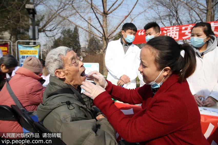 點擊下載本組圖片 醫務人員給老人檢查牙齒。(陳曉根/人民圖片) (聲明:凡帶有“人民圖片”字【詳細】