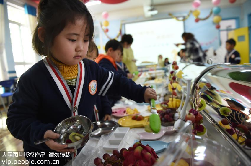 點擊下載本組圖片 4月13日,幼兒園小朋友正在自助選擇自己喜歡的菜肴。(王志強/人民圖片) 【詳細】