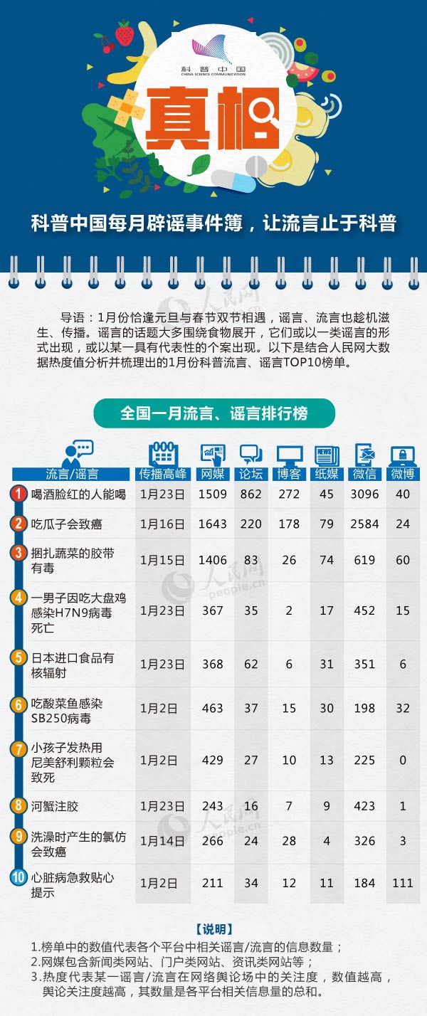 人民網北京3月3日電 今年1月,網絡上充斥了形形色色的科學謠言、流言,包括“喝酒臉紅的人能喝”“吃瓜【詳細】