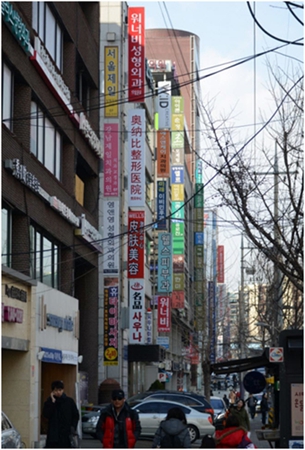 韓國首爾江南地區的狎鷗亭洞是當地著名的“整形一條街”,站在狎鷗亭地鐵口,無論朝哪個方向看,都是密密層層的整形醫院招牌,一公里半徑內云集了三四百家整形機構。新的招牌還在不斷掛出,越來越多機構不得不扎堆在同一幢建筑里。