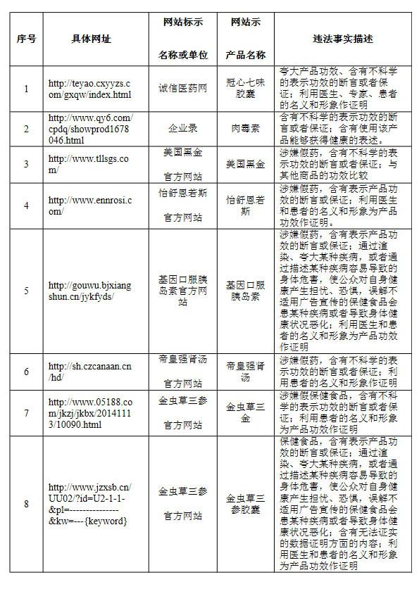近期,國家食品藥品監督管理總局監督檢查發現,“誠信醫藥網”等8個互聯網站發布虛假產品信息,涉嫌銷售假劣產品,欺騙誤導消費者,嚴重危害公眾飲食用藥安全。總局已將這些違法網站移送有關部門依法查處,并正在組織對違法產品的查處。