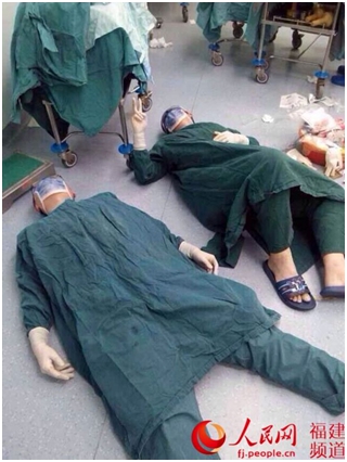 2014年6月22日,在手術室里連續工作了32個小時后,福建醫科大學附屬協和醫院的醫護人員紛紛累癱在手術臺邊,陳松醫生給出了勝利的手勢。