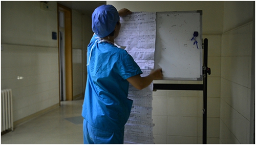 晚下班的不止甘承一個(gè)。“我們總共有15個(gè)手術(shù)間,現(xiàn)在還有好幾個(gè)正在做手術(shù),估計(jì)最晚的得到十一二點(diǎn)。”護(hù)士長(zhǎng)馬紅彤向我們展示了今天的手術(shù)單,一張張單子拼接在一起,“拉開(kāi)看看,怎么也有三米。”