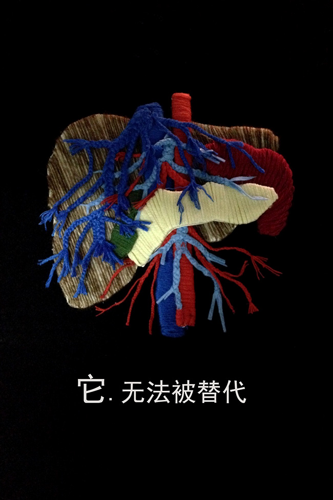 該作品利用毛線、不織布等材料做出肝臟的形狀,意在告訴讀者:肝臟的造型雖然可以被模仿被復制,但是我們的肝臟是唯一且無法被替代的,呼吁大家加強對肝炎的防控。(圖文/大連醫科大學姜雨思 沈陽理工大學蘇治文)