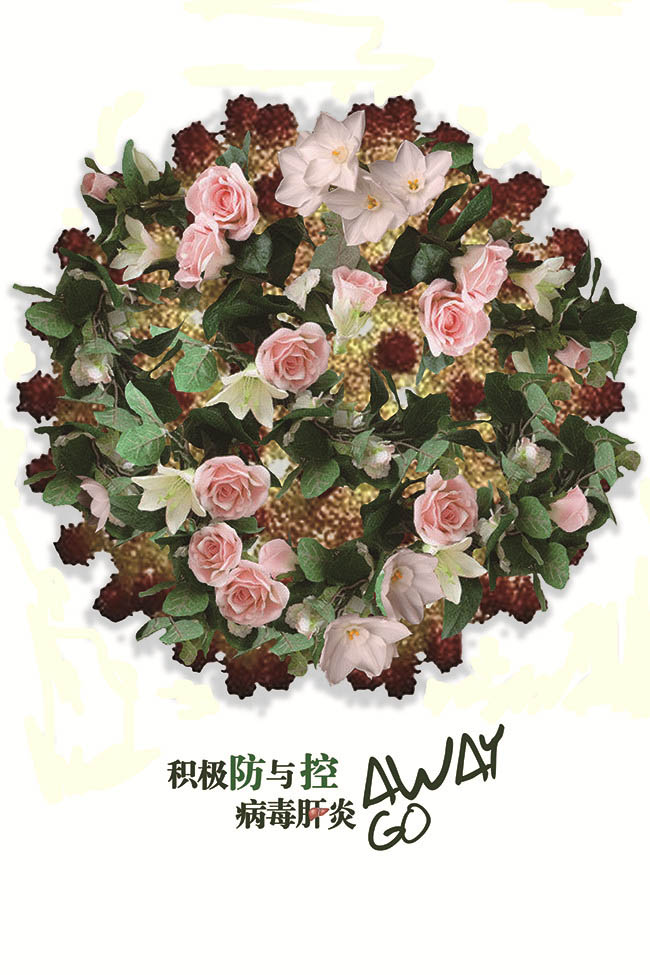 該作品呈現給讀者的是一個被自然、健康、有生命力的花兒們纏繞的乙肝病毒,作者運用年輕活潑的表達形式鼓勵患者積極面對乙肝病毒,并堅信頑強防控的人必將戰勝病毒。(圖文/廈門大學武劉鑫琳)
