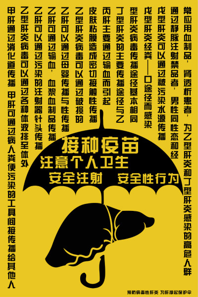 許多人認為病毒性肝炎離我們很遠,可以不加以重視。但事實上,病毒性肝炎的傳播途徑如雨水一般,就存在于我們生活和身邊。在該作品中,作者通過較緊密的文字形成“雨水”借以引起觀者的注意與警惕,同時文字內容也兼具科普性與可讀性。作者將病毒性肝炎科學的預防方法與保護傘的形象相結合,在“雨水”中為肝臟撐起一把保護傘,不僅突出了大賽主題,也清晰明了地為觀者提供了關于病毒性肝炎的科普知識。(圖文/廈門大學卓馨宇)