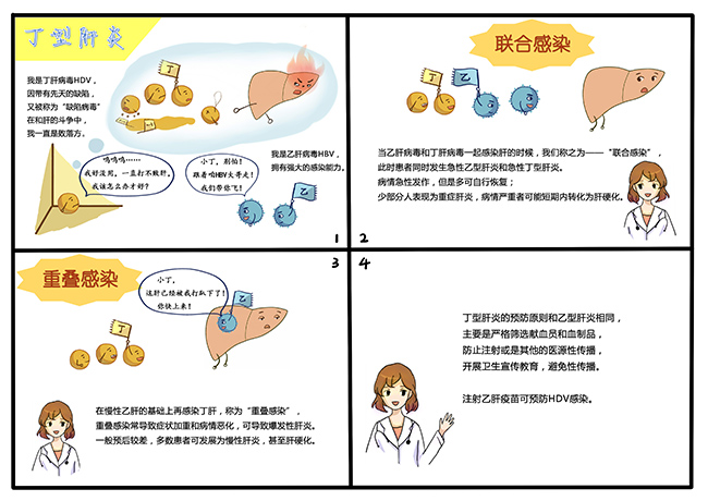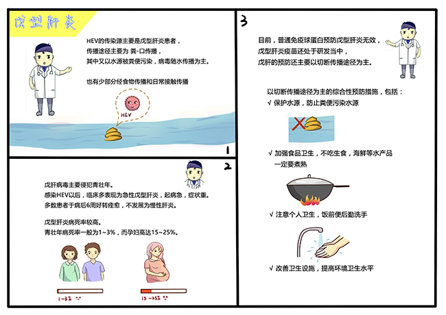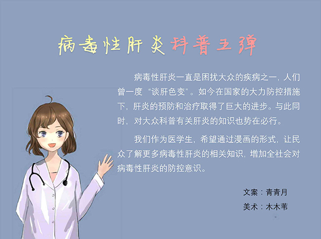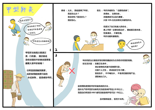 病毒性肝炎是由多種肝炎病毒引起的常見傳染病,具有傳染性強(qiáng)、傳播途徑復(fù)雜、流行面廣泛,發(fā)病率較高等特點(diǎn)。該作品通過5幅生動(dòng)形象的漫畫,分別介紹了甲、乙、丙、丁、戊五種病毒性肝炎的傳播途徑、病情發(fā)展以及防治措施。漫畫或以患者的視角講述,或以接受免疫的兒童的視角講述,或以病毒的視覺講述,形式多樣,通俗易懂。同時(shí),小醫(yī)生的角色貫穿整個(gè)系列的漫畫,生動(dòng)形象地對(duì)與病毒性肝炎相關(guān)的醫(yī)學(xué)內(nèi)容進(jìn)行科學(xué)講述。(圖文/北京大學(xué)魏林葦 馬婧玥)