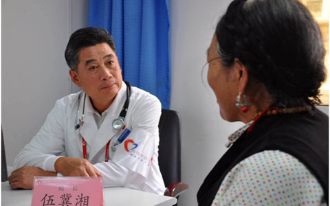 7月9日上午,“共鑄中國心”公益活動的義診現場,雅江縣人民醫院門口已經排滿了看病的人。有個穿著藏族服飾的婦女在人群中格外顯眼,她笑著對旁邊的人說:“聽說北京來了專家,來看看我多年的老毛病!”北京同仁醫院伍冀湘院長和隨行的醫生在縣長的陪同下也到達了醫院,雅江人民醫院院長正在等候他們的到來。