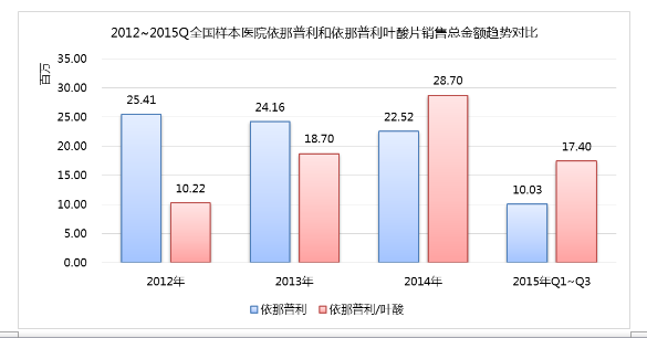 據艾美達全國樣本醫院數據庫顯示,馬來酸依那普利葉酸片在其ATC4 C09AA大類下,由2012年2.24%的市場占有率提升至2015年前三季度7.03%,而馬來酸依那普利由2012年5.57%降至2015年前三季度4.05%,馬來酸依那普利葉酸片2012~2014三年復合增長率高達67.5%,在銷售金額上,馬來酸依那普利葉酸片也遠遠趕超了依那普利。