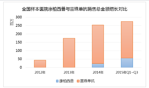 在艾美達全國樣本醫院數據庫中顯示,康柏西普無論是在銷售金額還是銷售量方面,在上市之后均有快速增長,擠壓了雷珠單抗市場占有率:銷售額由2014年9.18%上升至20.39%,銷售量由2014年10.82%上升至25.59%。