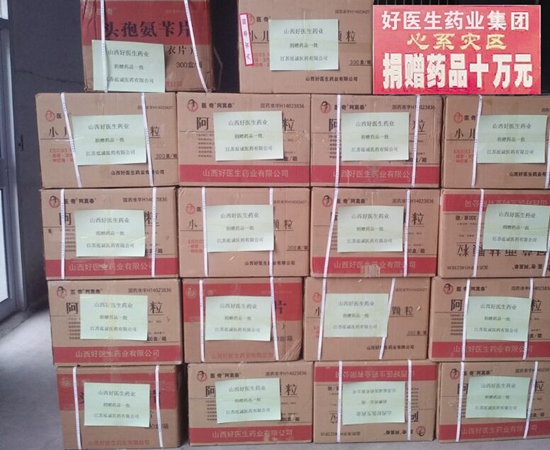山西好醫(yī)生藥業(yè)當?shù)剞k事處人員將迅速將該情況匯報給總部后,山西好醫(yī)生藥業(yè)有限公司總經(jīng)理劉漢軍遂作出了向災區(qū)支援10萬元藥品的決定。6月26日,山西好醫(yī)生藥業(yè)當?shù)剞k事處人員賀定霞、賀定輝在當?shù)蒯t(yī)藥公司的幫助下,帶著價值10萬元的藥品前往災區(qū)進行捐贈。