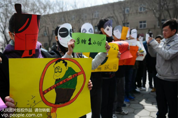 2013年3月21日,在山東聊城大學校園內,大學生志愿者們用行為藝術宣傳健康睡眠。(張振祥/人民圖片)