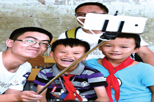 參加活動的大學生周志男和坡峨小學的學生開心地玩起自拍(圖片來源:人民網(wǎng) 黃炎翮 攝)