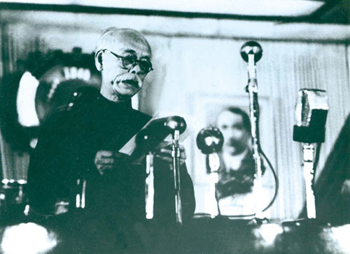 圖為1949年9月24日,農工黨首席代表彭澤民代表農工黨在全國政協一屆全體會議上發言
