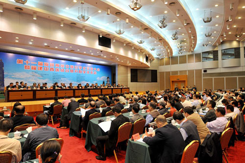 圖為2014年11月8日,第十一屆海峽兩岸中醫藥學術交流大會在福建省福州市開幕。400余位來自海峽兩岸中醫藥專家、學者及外國來賓歡聚一堂,共商弘揚中醫藥文化大計。本次大會由中國中醫藥研究促進會等共同主辦,臺灣中華中醫藥學會等8家單位協辦