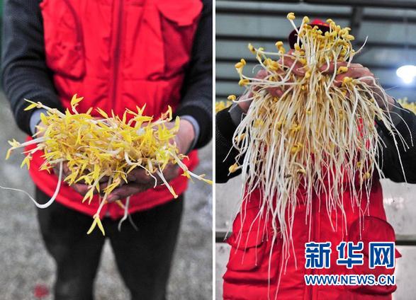 天津寶坻區一家蔬菜公司的工人展示該公司生產的正常的黃豆芽(右)和綠豆芽(左)。(新華社記者 翟健嵐 攝)