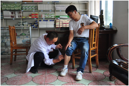 此時的王虎軍正蹲在地上,給一位四十來歲的男患者的腿上施針;一位五十幾歲的女患者坐在不遠處的木椅子上,手臂上也扎著針灸;坐在靠窗邊的木頭沙發(fā)上,還有三位患者等待就醫(yī)。施完針,王虎軍大步走回座位上,給一個七旬的老婦量血壓,老人身后還站著一位懷抱嬰兒的年輕母親和三五個男女,時不時有幾個小朋友嬉鬧著從這些大人的身邊跑來跑去……原來,這些都是一早來找王虎軍看病的患者和家屬。見到記者進來,王虎軍根本抽不出時間和記者打招呼,只能歉意地點點頭,示意等候片刻。