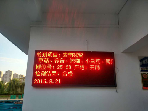 江店農貿市場的這間“食品快速檢測室”速度很快,這個“快”首先體現在檢測速度和公布速度上。江店食藥監所所長舒暢告訴人民網記者,在江店農貿市場內共有108家攤位,每日都會從這108家攤位中隨機抽取不少于15件樣品,抽檢結果出來后會立即實時傳輸到位于江店農貿市場一進門、快速檢測室旁邊的LED顯示屏上。