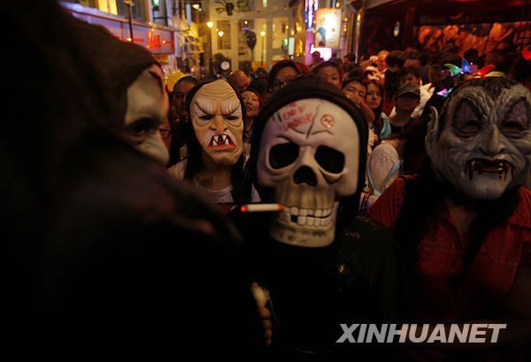 10月31日夜晚,狂歡者在香港蘭桂坊參加萬圣節活動。(圖片來源:周磊/新華網)