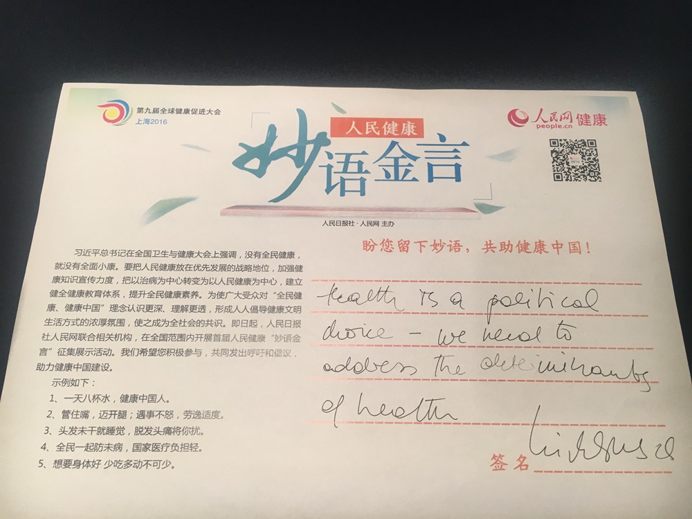 瑞士日內(nèi)瓦大學(xué)國(guó)際關(guān)系與發(fā)展研究院客座教授Ilona kickbush 參與人民健康妙語(yǔ)金言征集活動(dòng)