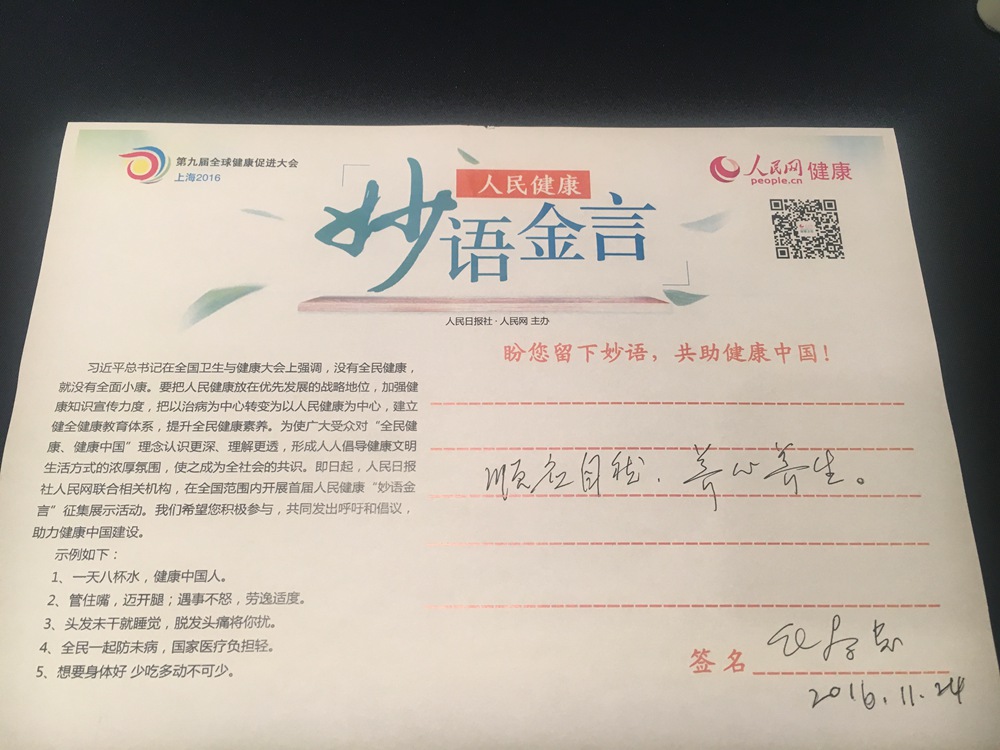 中國(guó)國(guó)家衛(wèi)生計(jì)生委宣傳司司長(zhǎng)毛群安參與人民健康妙語(yǔ)金言征集活動(dòng)