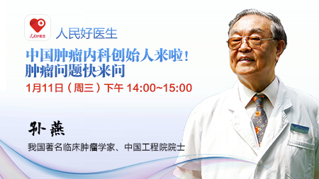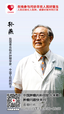 1月11日(周三)14:00-15:00,由人民日報社人民網、健康時報聯手打造的“人民好醫生”客戶端將邀請我國著名臨床腫瘤學家、中國工程院院士孫燕進行視頻、圖文直播,在線解答關于腫瘤的預防、放化療治療等相關問題,期待您的提問和參與。