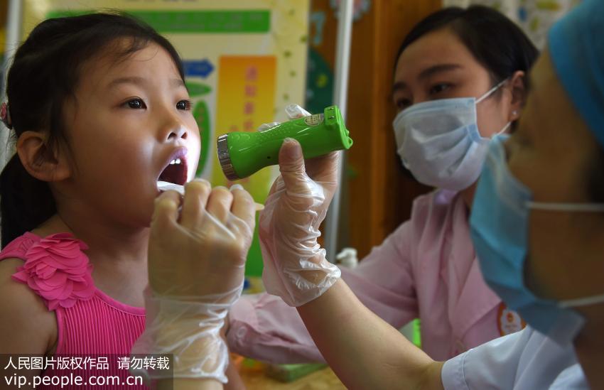 2015年6月12日,在合肥市瑤海區九獅水岸幼兒園,疾控工作人員正在對孩子們進行手足口病檢查和采樣,宣傳講解手足口病的相關防控知識。(解琛/人民圖片)