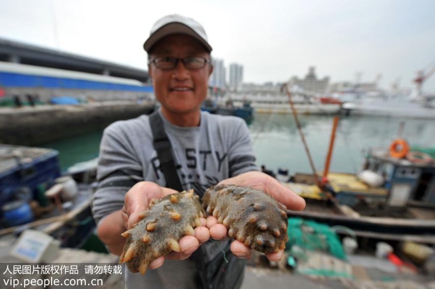 一名漁民在青島小港碼頭上售賣當天捕獲的半斤重野生海參。(王海濱/人民圖片)