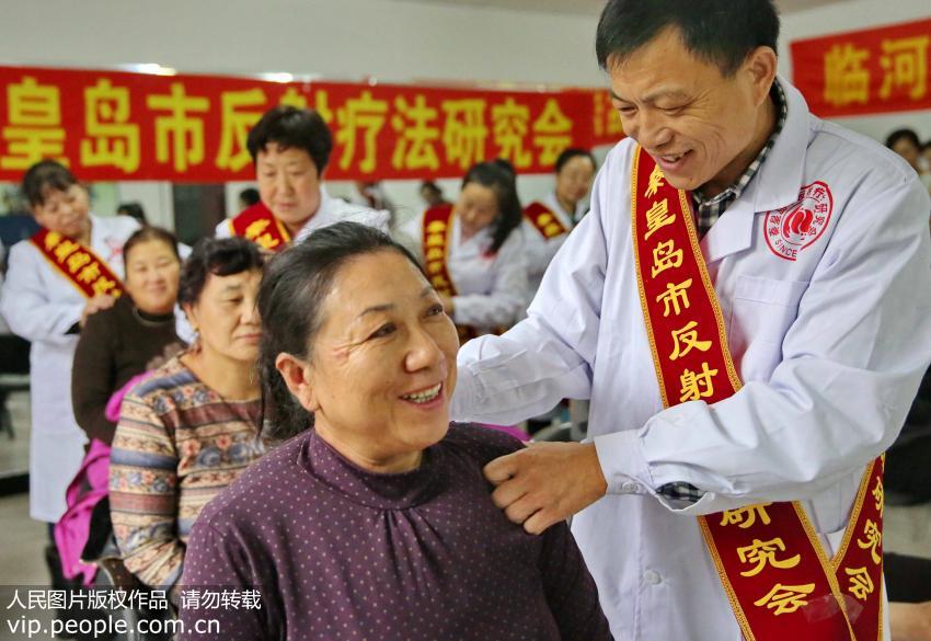 秦皇島市海港區(qū)臨河里社區(qū)志愿者為社區(qū)居民免費按摩。(曹建雄/人民圖片)