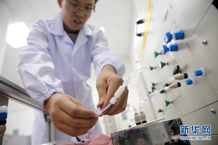 中國科學院武漢物理與數學研究所人體肺部磁共振成像實驗室,實驗人員在超極化裝置前收集實驗氣體。(金立旺/新華社)