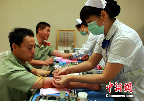 武警總醫(yī)院醫(yī)護人員為“忠誠衛(wèi)士”們進行抽血檢驗。(鄭麗萍/中國新聞網)