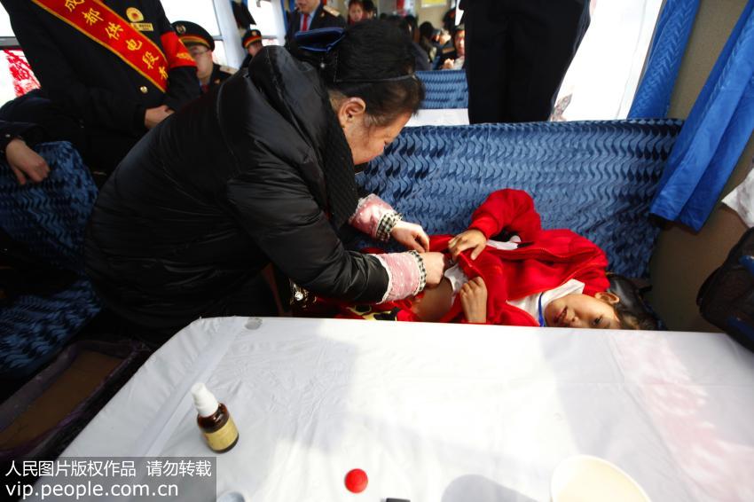 2月7日12時許,由成都鐵路局成都供電段支援擔當的從杭州開往成都的3337次“共青團號”列車上,通過列車廣播尋找的醫生唐家清正在為急性腹痛女孩進行中醫針灸治療。(胡志強/人民圖片)