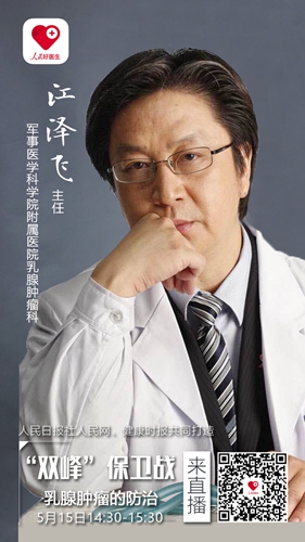5月15日(周一)下午2:30,由人民日報社人民網、健康時報聯手打造的“人民好醫生”客戶端將邀請軍事醫學科學院附屬醫院(解放軍第307醫院)乳腺腫瘤科主任江澤飛在線科普乳房養護、乳腺癌的預防,并解答大家關于乳腺癌治療方案選擇等方面的問題。雙峰保衛戰即將拉響,你準備好了嗎?