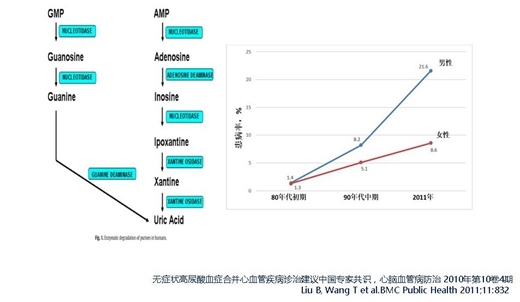2011年發布在BMC Public Health的研究指出,從1998-2010年間發表的高尿酸血癥流行病調查的59個研究可以看出:近30年間我國HUA患病率平均增加近20倍,其中男性由1.4%上升到21.6%;女性由1.3%上升到8.6%,男性上升幅度明顯大于女性。