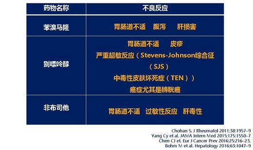 目前,臨床降尿酸藥物主要分為三類:抑制尿酸生成(以別嘌呤為嘌呤類代表,以非布司他為非嘌呤類代表);促進尿酸排泄(以苯溴馬隆、丙磺舒、苯磺唑酮為代表促進尿酸腎臟排泄藥,以活性炭類吸附劑為代表的促尿酸腸道排泄藥);促進尿酸分解的藥物(以尿酸氧化酶為代表)。降尿酸藥物副作用比較大,例如別嘌呤醇可引起Stevens-Johnson綜合征(嚴重超敏反應)和TEN(中毒性皮膚壞死癥),主要引起皮膚剝脫和粘膜的破壞,還會累及到器官系統,死亡率高。因此,不推薦無癥狀HUA者服用!