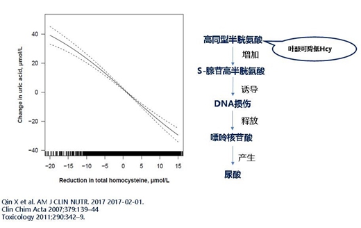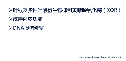 早在1984年Lewis AS等人在J Biol Chem研究稱,葉酸及多種葉酸衍生物通過抑制黃嘌呤氧化酶(XOR),改善內皮功能,DNA損傷修復等三種途徑有效降低尿酸濃度。