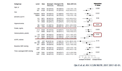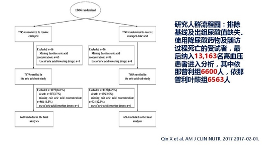 2017年,我國科研工作者在AM J CLIN NUTR撰文指出,以在高血壓人群中探索葉酸治療對降低血尿酸水平的療效為研究目的,以一項隨機對照雙盲臨床試驗,納入20個社區的高血壓人群,隨機分配至依那普利組(每日口服10毫克依那普利)和依那普利葉酸組(每日口服10毫克依那普利和0.8毫克葉酸),平均隨訪4.5年為研究設計,以尿酸濃度的變化,定義為出組尿酸濃度-基線尿酸濃度為首要終點事件,以高尿酸血癥控制率,定義為治療后尿酸濃度<357mmol/L,新發高尿酸血癥,定義為基線尿酸濃度正常(<357mmol/L)并且出組尿酸濃度在男性中≥417 mmol/L(7 mg/dL) 或在女性中≥357 mmol/L (6 mg/dL)為次要終點事件。排除基線及出組尿酸值缺失、使用降尿酸藥物及隨訪過程死亡的受試者,最后納入13,163名高血壓患者進入分析,其中依那普利組6600人,依那普利葉酸組6563人。