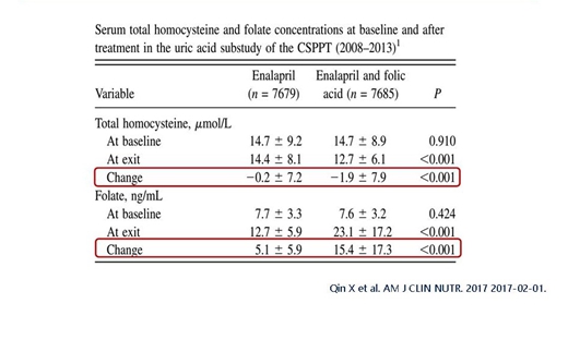 相比依那普利組,依葉組tHcy(總Hcy)水平顯著下降:對照組下降﹣0.2±7.2?mol/L,試驗組下降﹣1.9±7.9?mol/L;治療后,依那普利組和依葉組葉酸濃度分別平均增加5.1和15.4 ng / mL。兩組間基線tHcy和葉酸是完全可比的,經過治療患者,血清總Hcy及葉酸濃度,對照組、試驗組出現明顯分化。