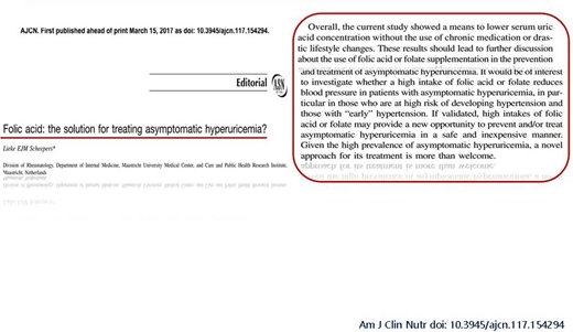 芬蘭一位科研工作者在Am J Clin Nutr doi對此科研成果發表評述:此研究提示了葉酸治療可作為預防和治療高尿酸血癥的一種新干預方式,尤其是對于伴隨高Hcy的無癥狀性高尿酸血癥人群!