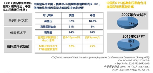我國腦卒中高發,臨床數據顯示:我國高血壓人群,腦卒中/心肌梗死發病比值約5~8:1。相較于美國,在排除傳統高血壓、高膽固醇血癥、糖尿病等病因基礎上,提出,伴有血同型半胱氨酸(Hcy)升高的高血壓患者,腦卒中的發病率明顯升高。中國約75%的高血壓患者合并血同型半胱氨酸升高。