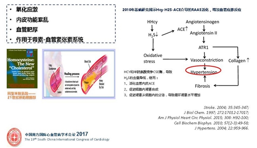 Hcy和RAAS的病理生理基礎為: Hcy和半胱氨酸競爭CSE酶,導致H2S的含量降低,繼而:1、活化血管內皮ACE;2、促進細胞內腎素合成;3、促進腎素從細胞內的分泌,導致循環腎素水平增加。