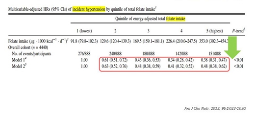 2012年,Am J Clin Nutr雜志發表文章,一項Coronary Artery Risk Development in Young Adults (CARDIA) study研究顯示:4400例受試者隨訪20年,高葉酸攝入,可使新發高血壓風險顯著降低52%。