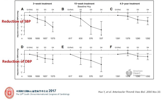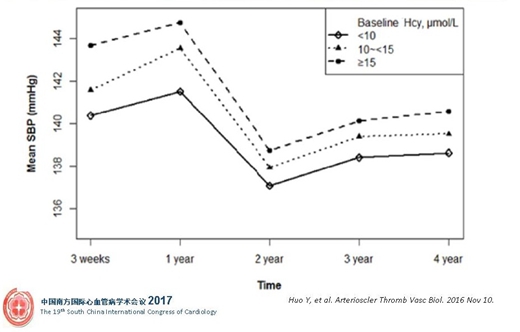 從這張圖可以看到,隨著Hcy水平的升高,收縮壓(SBP)經3周、15周和4.5年的平均下降值(入組時血壓-治療后血壓)逐漸減少,也就是說,基線Hcy水平越高,血壓越難降。Hcy水平影響高血壓患者短期、中期和長期降壓療效。研究報告見于霍勇教授2016年Arterioscler Thromb Vasc Biol雜志。