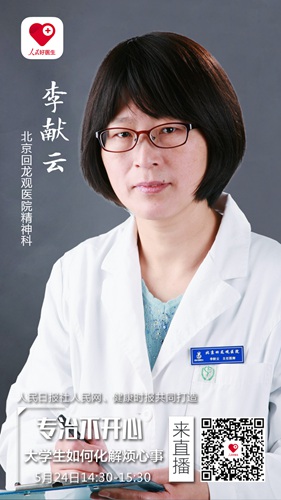 5月24日(周三)下午2:30,由人民日報社人民網、健康時報聯手打造的“人民好醫生”客戶端將邀請北京回龍觀醫院心理專家李獻云教授在線直播,如果您有考生心理健康、大學生心理困惑以及精神疾病等方面的問題想要咨詢,請移步客戶端給專家留言(具體方法見文末)。