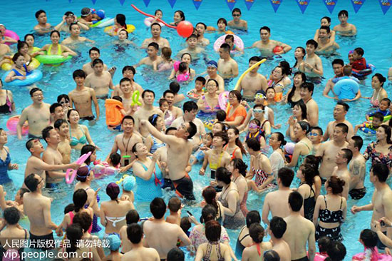 2017年5月20日,游客在北京奧體公園水立方戲水樂園內嬉水消暑。(樊甲山/人民圖片)