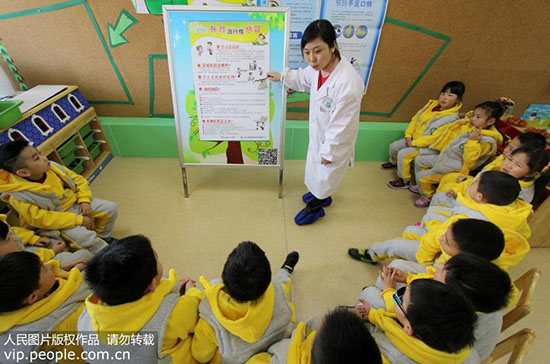 2017年2月13日,安徽省合肥市,蜀山區荷葉地街道社區衛生服務中心的醫護人員王希連走進轄區柏悅幼兒園,在開學第一天,給孩子們講解春季常見疾病及其預防知識,上好“健康第一課”。(陳三虎/人民圖片)