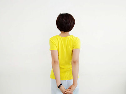 ②兩手十指相扣,放在身后,挺直手臂,向內扭轉腕部,使手掌盡量貼至臀肌處。