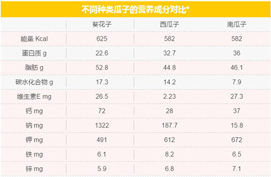 古往今來,從皇帝到百姓都“大愛”嗑瓜子,除去休閑娛樂的因素,瓜子中的營養成分也是不容小覷。以葵花子為例,其富含不飽和脂肪酸,人體必需的亞油酸含量約達到50%~60%。除富含不飽和脂肪酸外,葵花子中還含有多種維生素、鐵、鉀、鋅等人體必需的營養成分(見表)。可見,瓜子雖小,營養不少。
